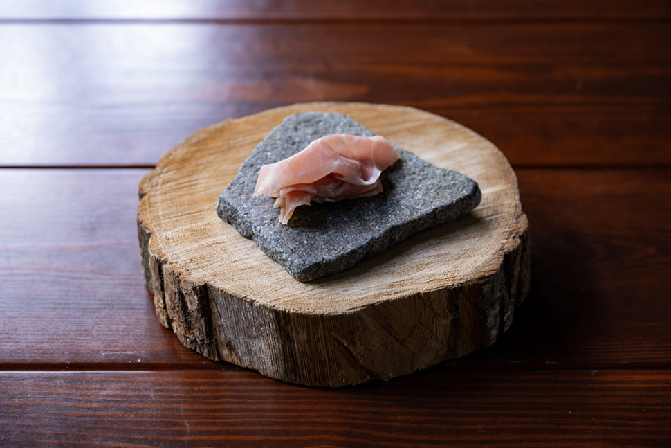Along with firewood-cooked cuisine, a specialty of Ca’enne is the naturally aged prosciutto served as the course menu opener. While in Italy, Usui worked in a prosciutto production facility in the Parma region and learned to make culatello prosciutto, which is called the “king of prosciutto.” Based on that production method, he makes his own prosciutto from pork produced in Nagano Prefecture, which he coats with the rice malt of locally made sake. Aged for a year while being exposed to the outdoor air of Yatsugatake, which can be as cold as minus 10 degrees Celsius in winter, the prosciutto is truly the taste of this land. More and more people are coming to Ca’enne from beyond the mountains and the ocean to experience a cuisine born of a phenomenon that has continued since the Jomon Period — the coexistence of nature and human beings.