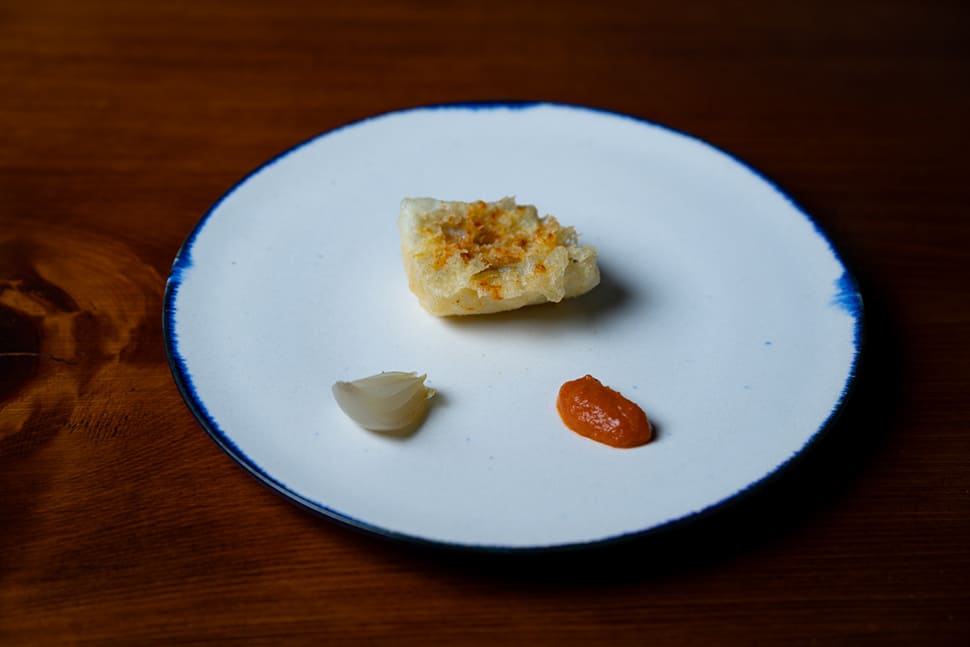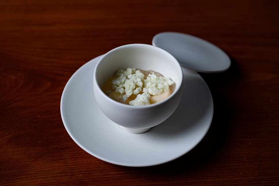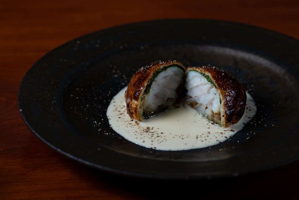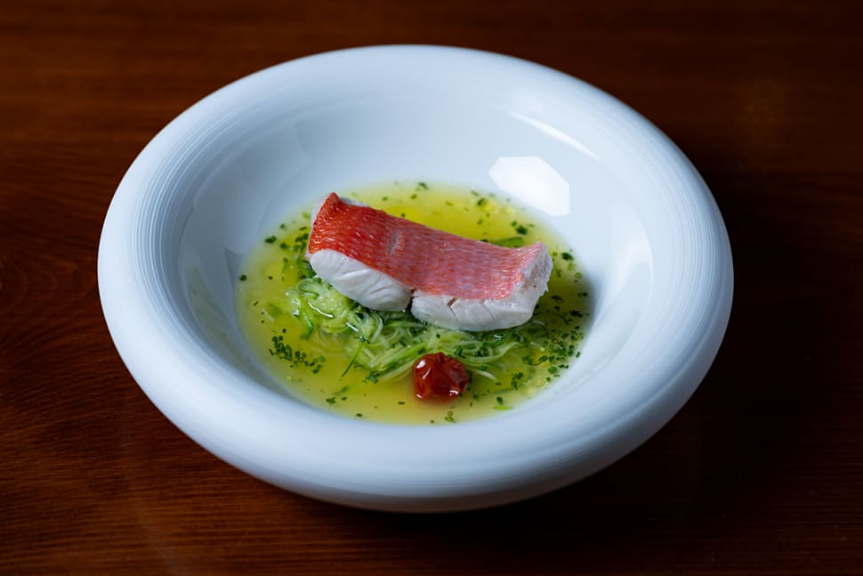 The problem was that fish caught in Yaizu arrived in Hiroshima a day and a half later, meaning a little of its freshness was lost. In his cuisine, Nishi wanted to use fish that had been caught in Suruga Bay the same morning. It was this wish that motivated him to move to Yaizu, despite the ongoing COVID-19 situation. In June of 2022, he opened the French restaurant Chisou Nishi Kenichi in a location three minutes on foot from Sasue Maeda Fish Shop. The restaurant’s exterior architecture is Japanese in style. In back is a courtyard, and in front there is an open kitchen with an eight-seat counter. Both lunch and dinner service are exclusively omakase (chef’s choice) course menus consisting of 10 or 11 dishes, eight of which feature fish in starring roles, and cost ¥16,500 ($110). The appetizer of “swimming aji” marinated in sansho pepper oil and soy sauce — made with horse mackerel that has been left to swim in an aquarium and regain energy after being caught — might be called Nishi’s take on sashimi. When the meaty fish is cut with a knife and placed on the taste buds, there is a delight that is quite different from the experience of conventional sashimi. Nishi’s fritters are made from Pacific rudderfish, the moisture retention level of which has been enhanced through the use of 12 types of ice of differing shapes and temperatures in the cooling process. The fish is fried in untoasted sesame oil, and the fritters are amazingly juicy.