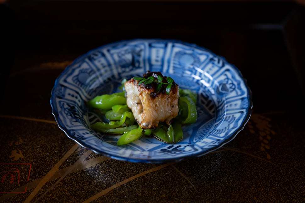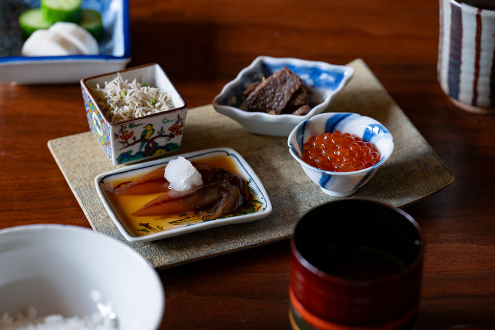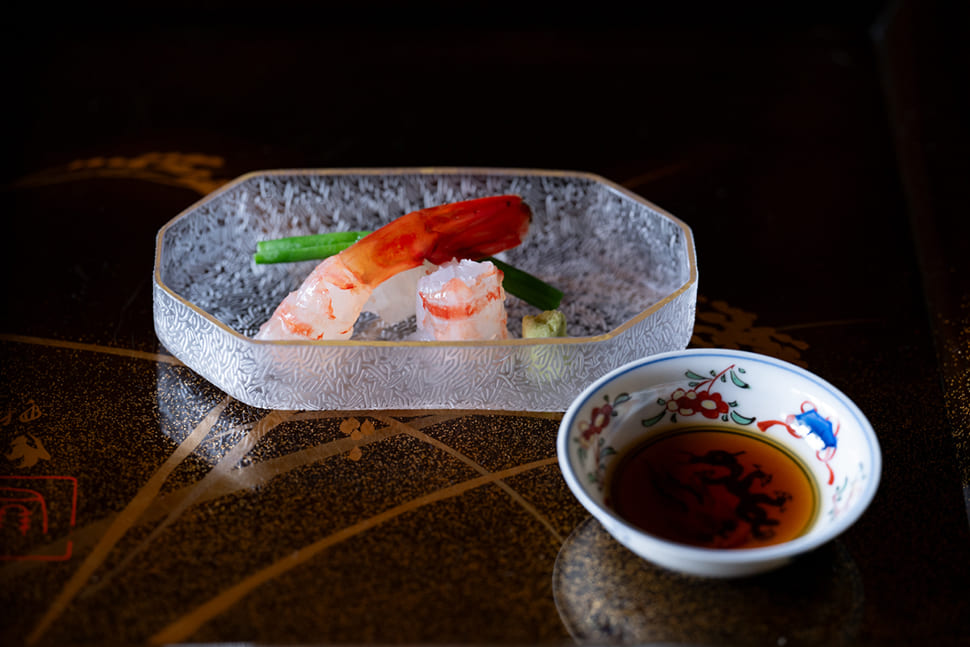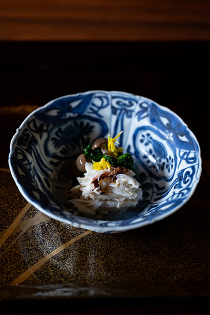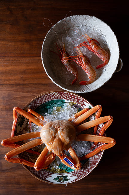Mura said, “It was time to rebuild the restaurant, since the structure was deteriorating with age and our financial outlook was good, so I made up my mind to go back and study cuisine again.” Though people he knew were astonished that he was starting afresh at the age of 40, Mura headed to Tokyo, where he went to work at a highly regarded Japanese restaurant. With the renewal of Ebitei-Bekkan in 2022, he made further changes to the restaurant. The atmosphere is modern and the course menu, which starts at ¥27,500 ($180) including tax, is served at a counter and in private rooms. The ingredients used are from Toyama Prefecture and other areas of the Hokuriku region. In spring, there are Japanese glass shrimp, cherry salmon and firefly squid. The winter menu includes crab as well as more unusual ingredients such as bear or boar meat. The generous use of superb antique dishes handed down over generations is a luxury unique to such a venerable establishment. Incorporating fresh ideas while preserving and carrying on tradition is an approach that matches the character of Toyama.
