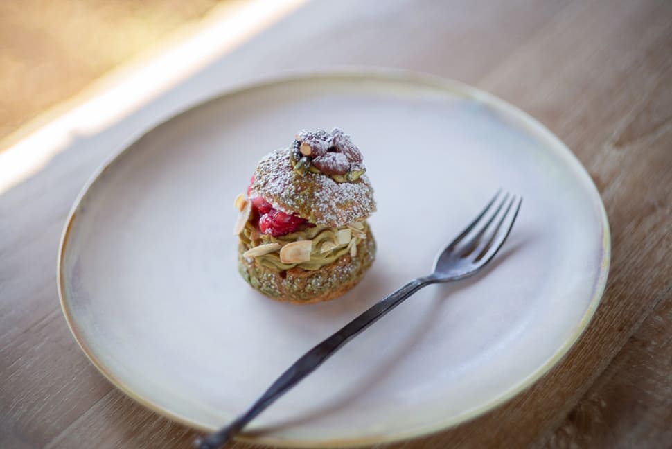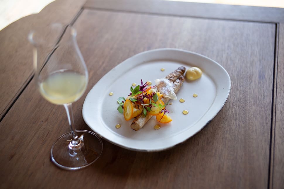 The restaurant’s course menu is embellished with produce from the kitchen garden, which features in everything from appetizers to desserts as either the main dish or in a supplementary role. Motooka prepares his gourmet offerings with fruit and vegetables harvested on the day; for example, a risotto might come with the last of the summer corn, and a vegetable mousse with kombu-cured shrimp might be garnished with nira garlic chive flowers.