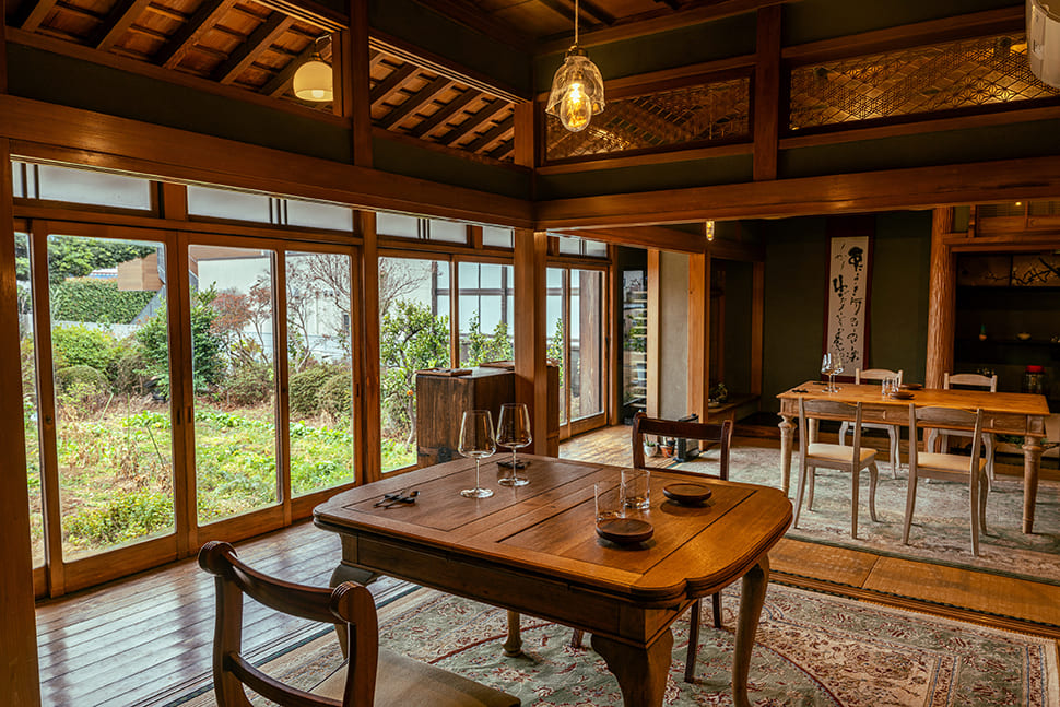 Motooka, who was born and raised in Hyogo Prefecture, chose as the location for his own restaurant a 70-year-old traditional house left by his wife’s late grandfather, who had run a landscaping business there. The house boasts beautiful fittings and ranma (decorative wooden panels above sliding doors or between rooms), showcasing the skill and techniques of traditional Japanese craftsmanship; it also offered Motooka the opportunity to grow vegetables in the garden. In spring and summer, he grows leafy greens and beans, and in fall he cultivates pumpkins and root vegetables like taro. He grows 30 or so varieties of vegetables and 30 kinds of herbs year-round. Along with vegetables, Motooka grows 12 kinds of fruit, including berries in spring as well as citrus fruits and figs.
