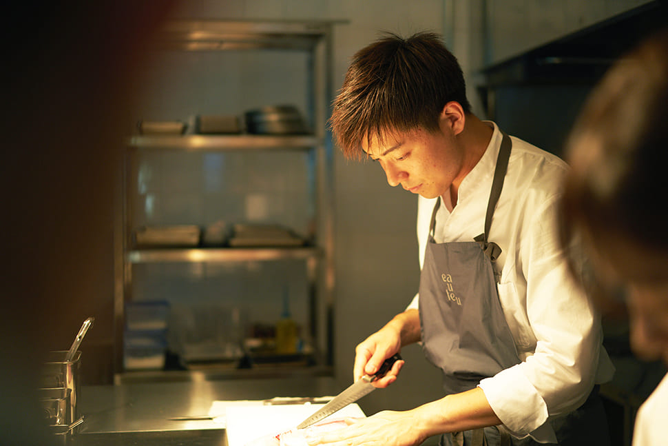 Auberge Eaufeu’s chef, Shota Itoi, was born in Kyoto Prefecture and trained in Kobe and France. The winner of a prestigious culinary competition in Japan, he received offers from a number of restaurants. But he was drawn to the concept of attempting to create a top-tier restaurant housed in a former school complex, and in 2021 he moved to Komatsu and joined the project in its pre-opening preparation phase.