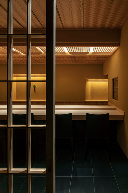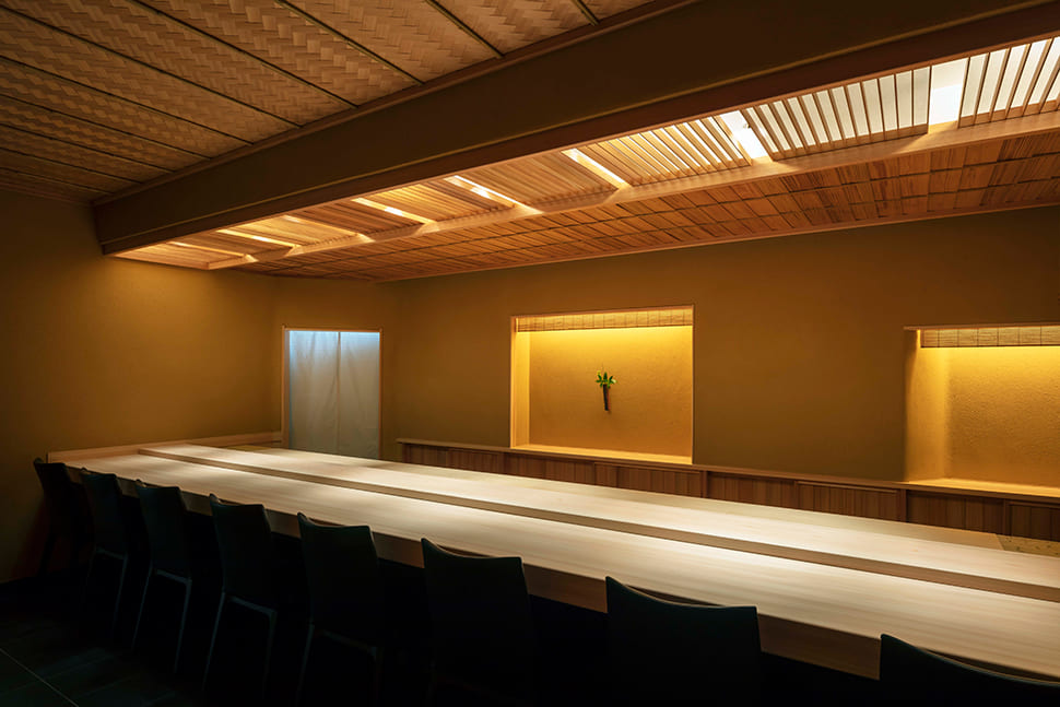 The interior brings to mind a teahouse, with features including a wickerwork ceiling made of Japanese cedar from Ehime. The counter, which is fragrant with the fresh scent of wood, accommodates eight diners. The omakase menu, priced at ¥27,500 ($180) including tax, is served in two seating periods starting at 5 and 7:30 p.m. Seventy percent of the guests are visitors from outside the prefecture, 10% of whom are tourists from other countries, mainly in Asia.